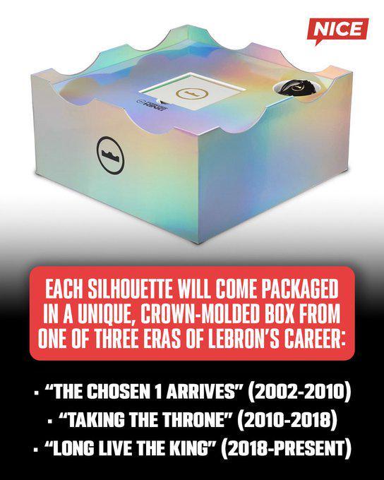据悉,耐克LeBron 23代的每款鞋都将采用独特的王冠造型鞋盒进行包装,这些鞋盒分别象征着勒布朗职业生涯的三个里程碑时期: